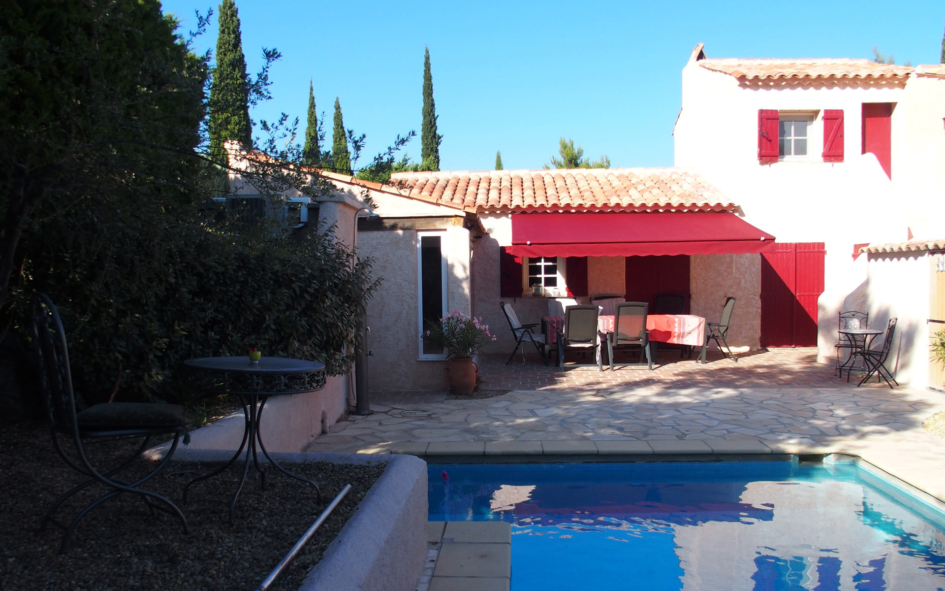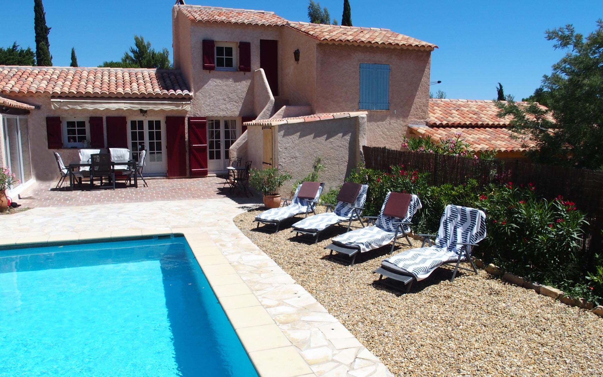 Die Außenanlage mit großzügiger Terrasse und Swimmingpool