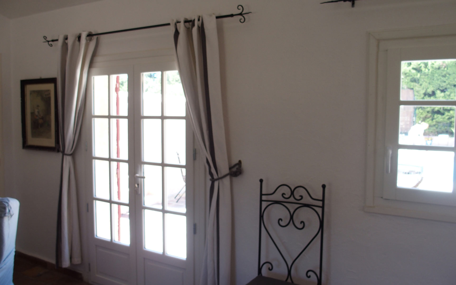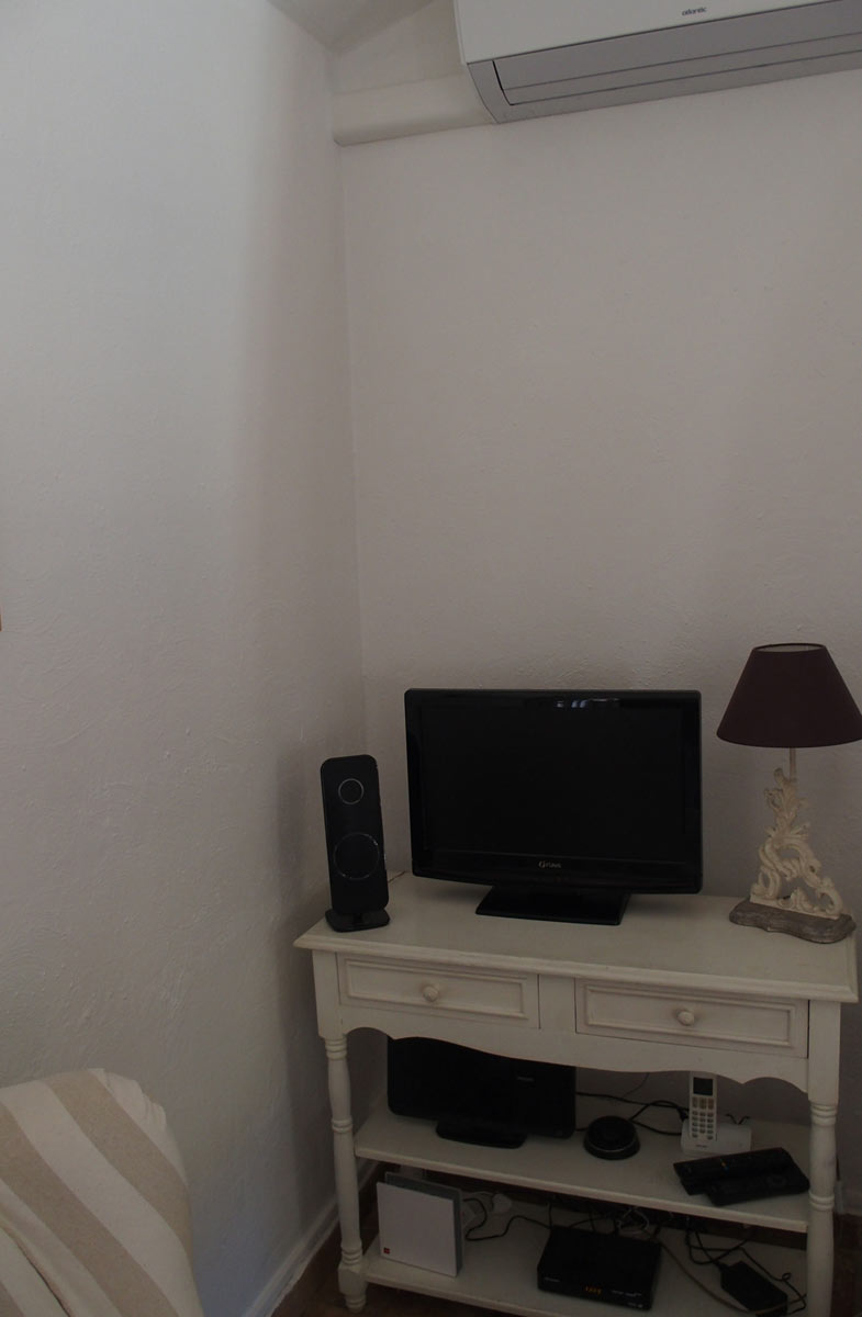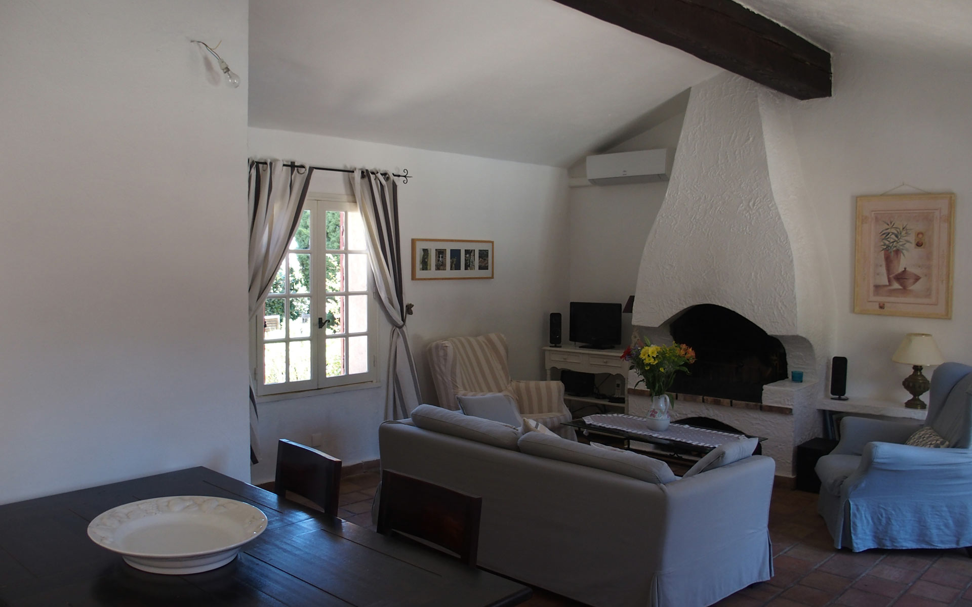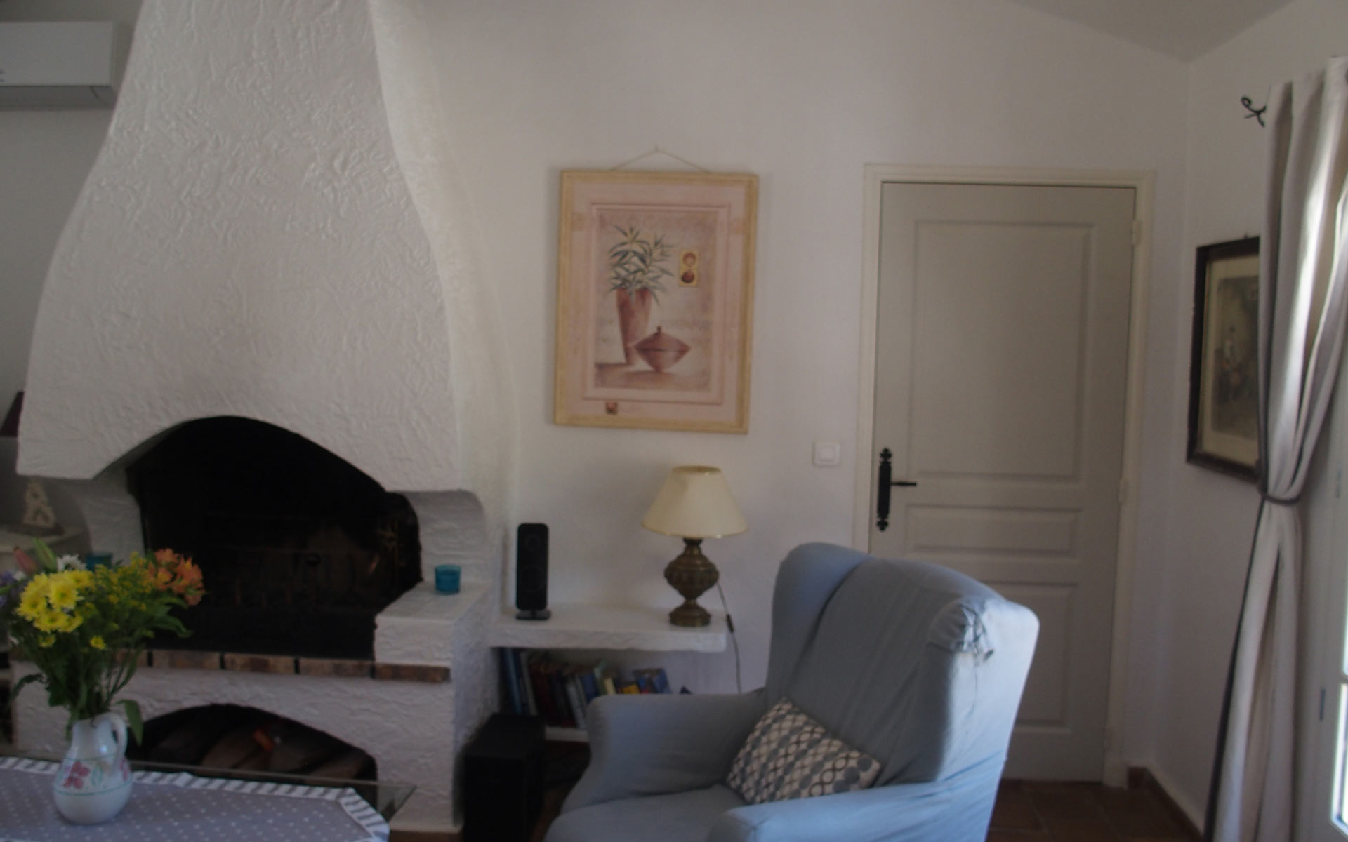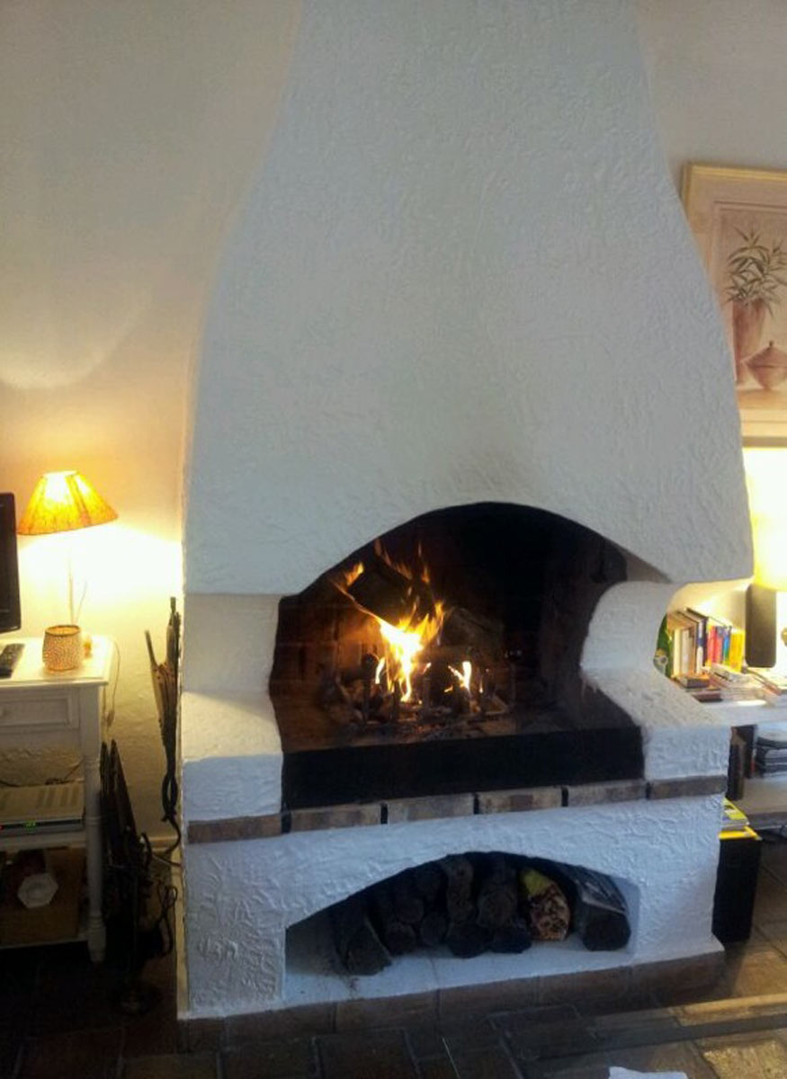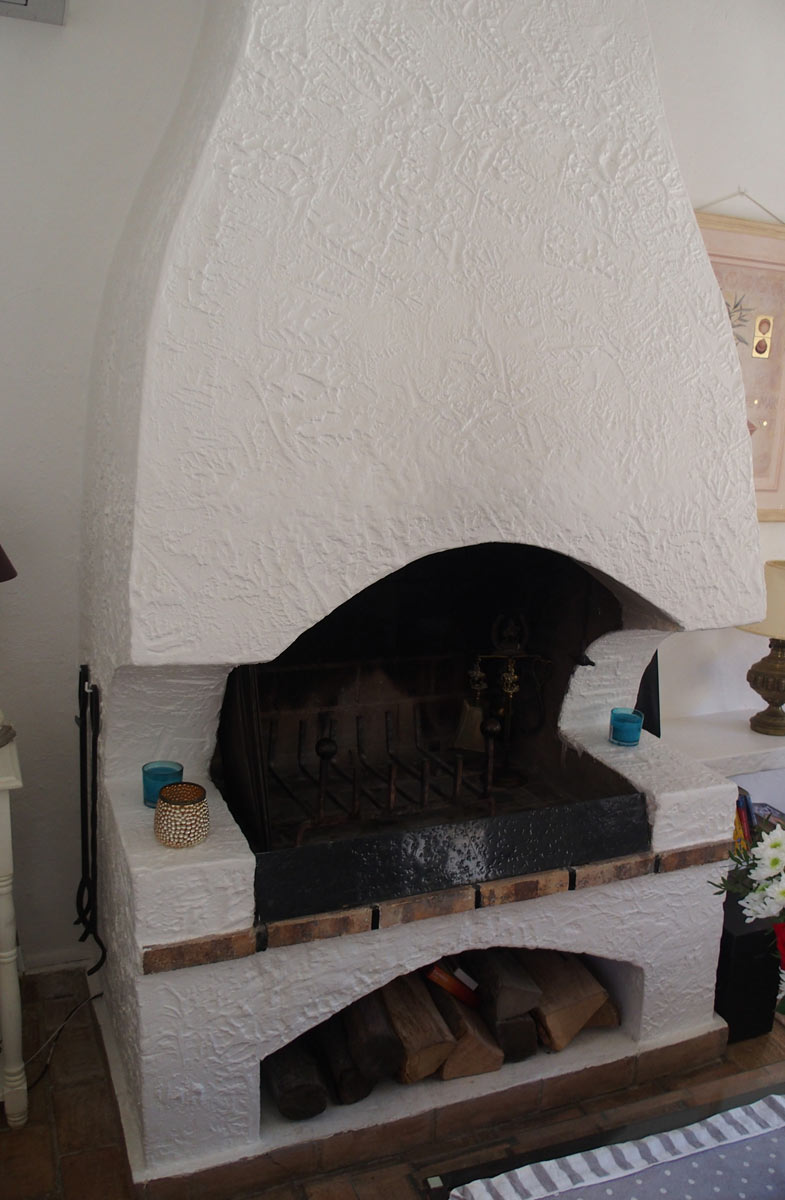 Das Wohnzimmer mit dem offenen Kamin strahlt eine mediterrane Atmosphäre aus und wird besonders im Winter geschätzt.