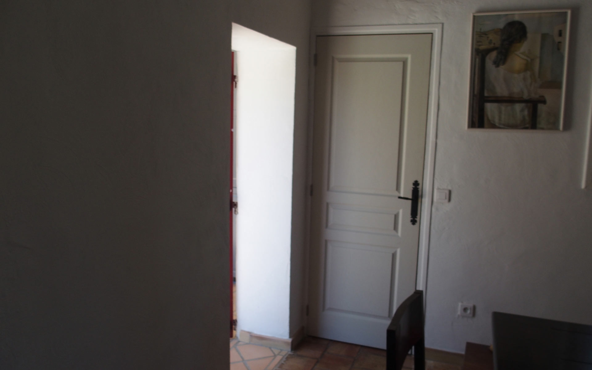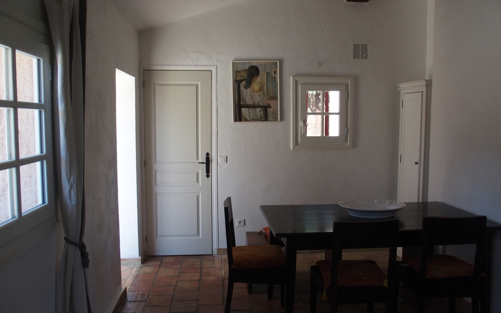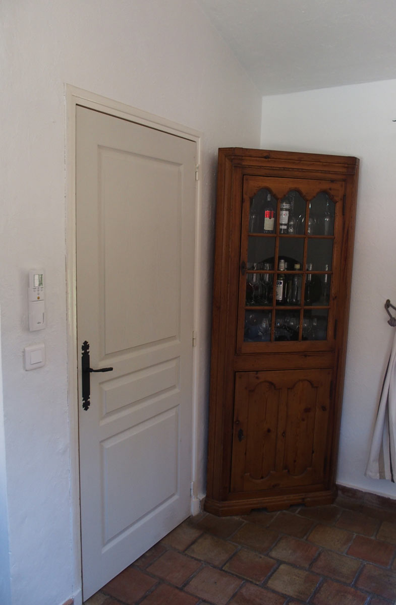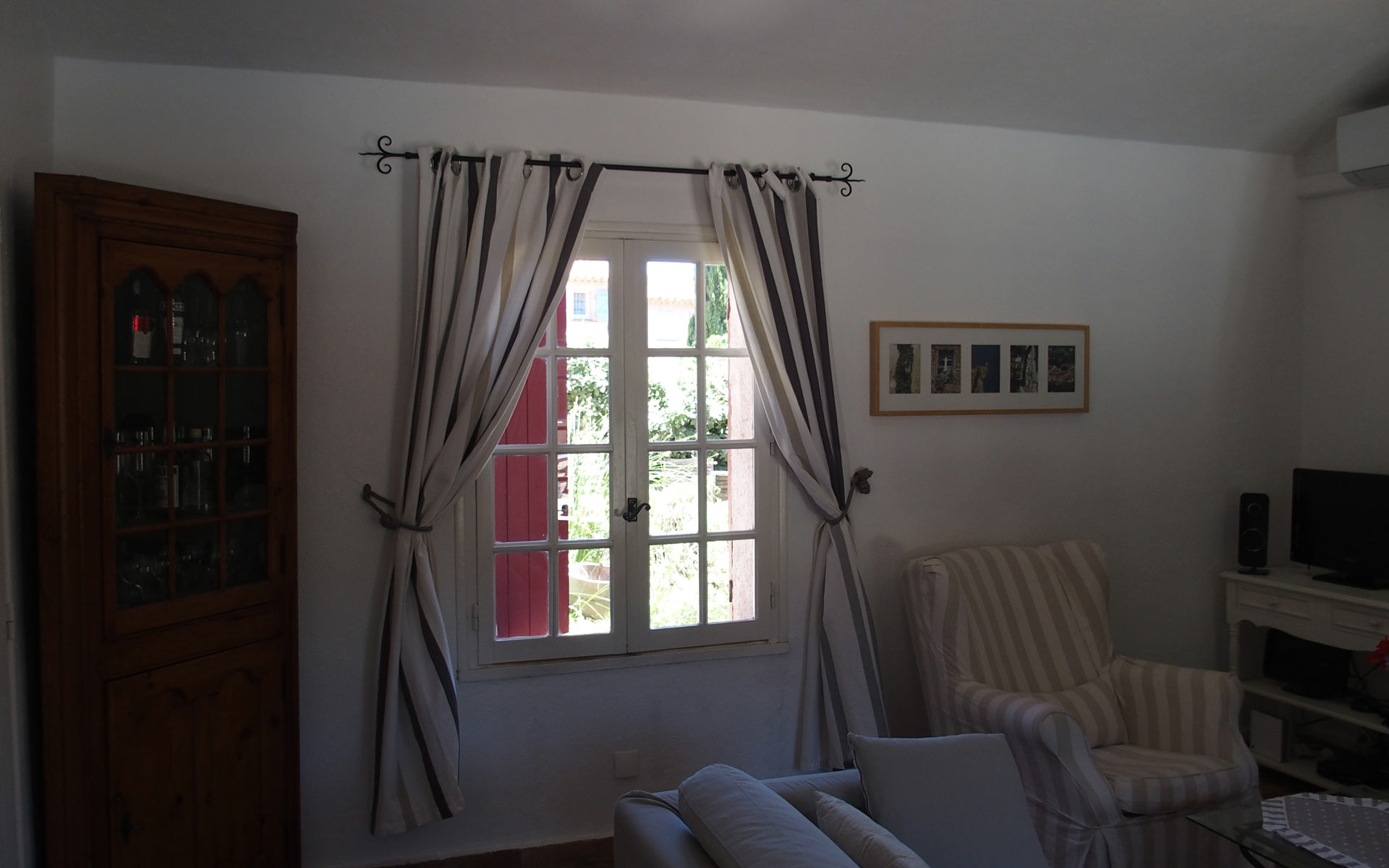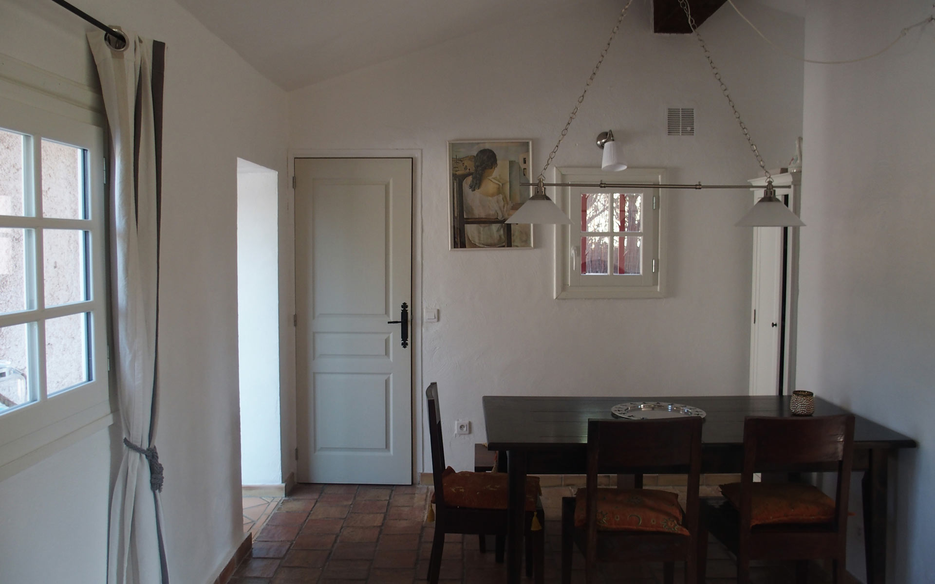 Das Wohnzimmer mit dem offenen Kamin strahlt eine mediterrane Atmosphäre aus und wird besonders im Winter geschätzt.